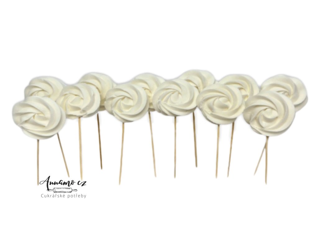 Bílé - Bílý cukr, vaječný albumin,regulátor kyselosti E330, zahušťovadlo E412, konzervant kyselina sorbová E200, potravinářské aroma vanilka, potravinářské barvivo: E170